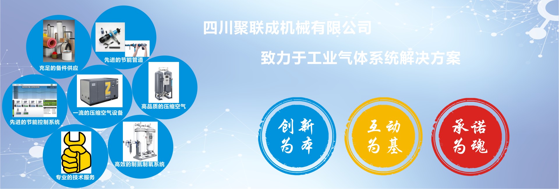 聚聯成一直致力于工業生產解決方案的系統供應商我們憑借與Atlas Copco(阿特拉斯·科普柯)、BEKO(貝克歐)、GardnerDenver(格南登福工業集團)CompAir(康普艾)、同悅氣體等國際品牌之間的密切合作關系,我們的解決方案包括氣體壓縮機、氮氣氧氣設備、空氣處理系統、維護保養、通過專業的產品技術與高級服務工程師團隊,具備專業的技能,聚聯成將為您提供優(yōu)質的產品和服務